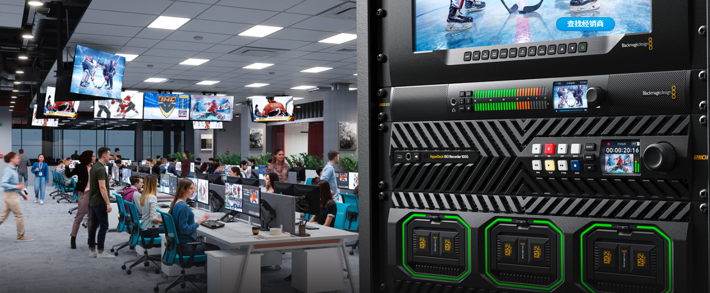 共享网络存储是后期制作工作流程的核心。HyperDeck ISO Recorder 100G可利用高速100G以太网录制到网络存储。100G以太网足以支撑8通道ProRes HQ Ultra HD录制。HyperDeck ISO Recorder 100G还设有两个专门的100G数据端口,作为冗余机制。录制到网络存储盘方便快捷,只要浏览网络存储服务器,然后选择相应文件夹即可。这样一来,剪辑师只要登录网络存储,就可以在同一个位置获取所有媒体文件。DaVinci Resolve甚至可以在媒体文件尚处于录制期间就开始剪辑!DaVinci Resolve蕴含的广播级播放功能使其成为一套极为强大的实时回放方案。