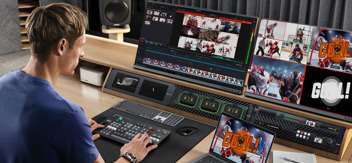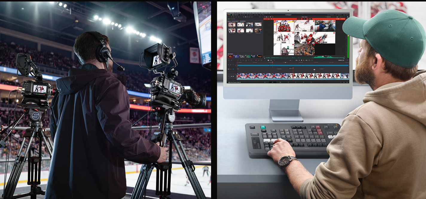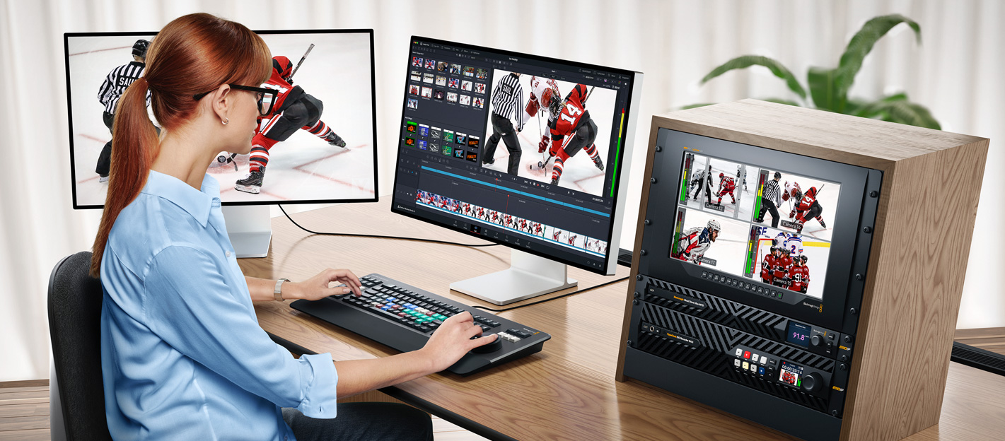 在现场制作期间录制所有摄影机画面,可以便于后续对节目进行重新剪辑和调色。HyperDeck ISO Recorder 100G可以录制到网络存储,因此您可以拥有多台工作站,并且都使用同一个存储,即使正处于录制状态也可以访问,这一方案令实况体育节目的重播制作变得更加便捷,同时也降低了成本。下载免费的DaVinci Resolve,一切便准备就绪。所有摄影机都会在检视器中以多画面分割的方式显示,您可以通过滚动操作实时查看各台机位角度,选出自己喜欢的角度后,按下On Air就可以将画面切入直播。在当前播出期间,您还可以继续在DaVinci的多画面分割视图中选择新的角度。添加DaVinci Resolve Replay Editor面板,还可以进一步提升重播制作效率!