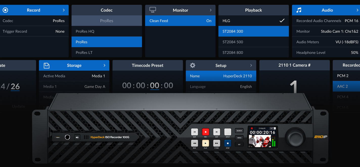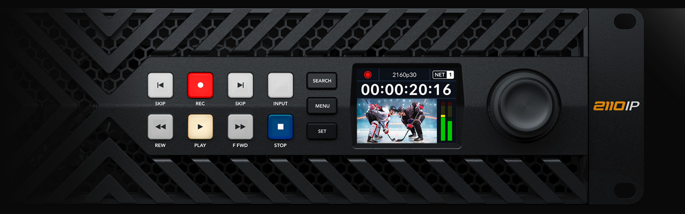 HyperDeck ISO Recorder可通过100G以太网实现SMPTE-2110连接,因此单个物理接口就能连接所有8路录制和播放视频通道!此外,两个单独的100G以太网端口可提供冗余机制,您可以将每个端口连接到完全独立的网络交换机。这一机制叫做“SMPTE 2022-7无缝保护切换”,它可以将视频和音频的两个相同副本通过两个连接发送,而接收端则会比对接收到的RTP数据包序列号,然后从最先到达的像素数据包中重建完整的视频帧。这一切换完全无缝,不会出现丢帧或音频瑕疵。