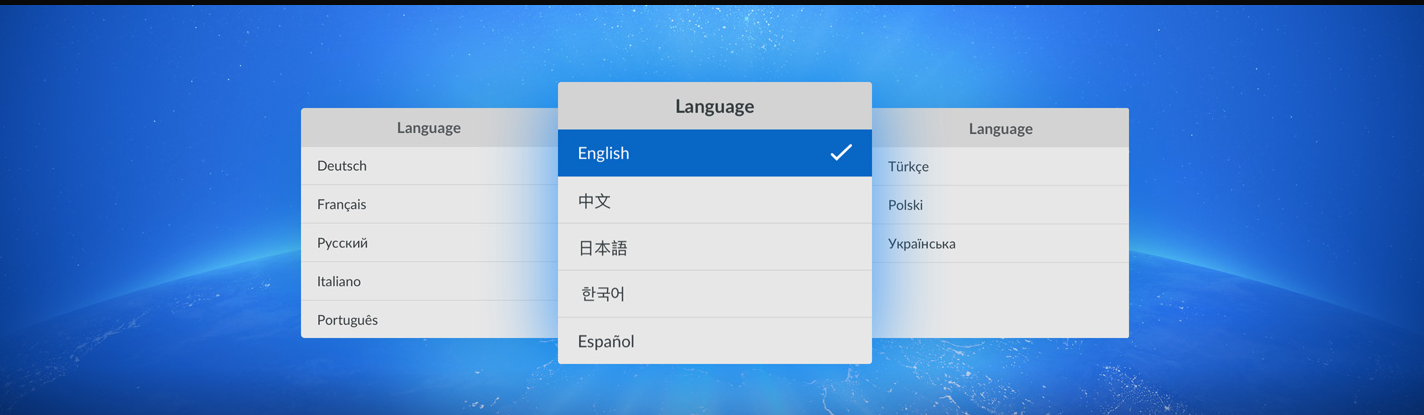 HyperDeck ISO Recorder 100G支持多语言界面,使用起来毫无障碍!支持的语种包括英语、中文、日语、韩语、西班牙语、德语、法语、俄语、意大利语、葡萄牙语、土耳其语、波兰语以及乌克兰语。首次开机时,HyperDeck ISO Recorder 100G会弹出菜单让您选择语言,之后可通过LCD菜单随时更改语言显示。选定语言后,LCD菜单将会发生更改,并且监看输出上的叠加显示信息也会更改为所选定的语言显示。不论您来自哪个国家和地区,都能顺利使用HyperDeck ISO Recorder!