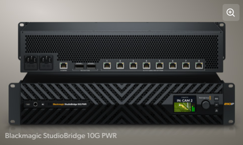 添加一台Blackmagic StudioBridge 10G PWR,就可以利用低成本10G以太网连接到SMPTE-2110设备。这一方案可将HyperDeck的100G端口拆分为8个10G以太网2110 IP视频接口。此外,每个10G以太网端口都具备90W PoE++电源!
